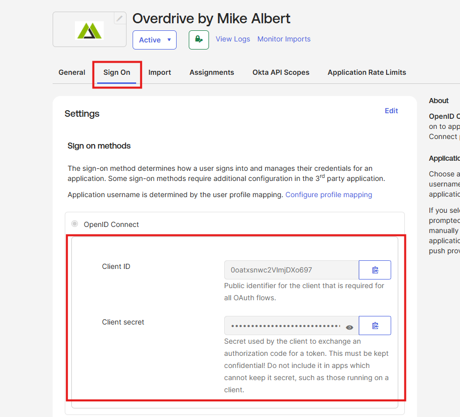 Go to the Mike Albert Overdrive App → Sign On tab and note of the Client ID and Client Secret.