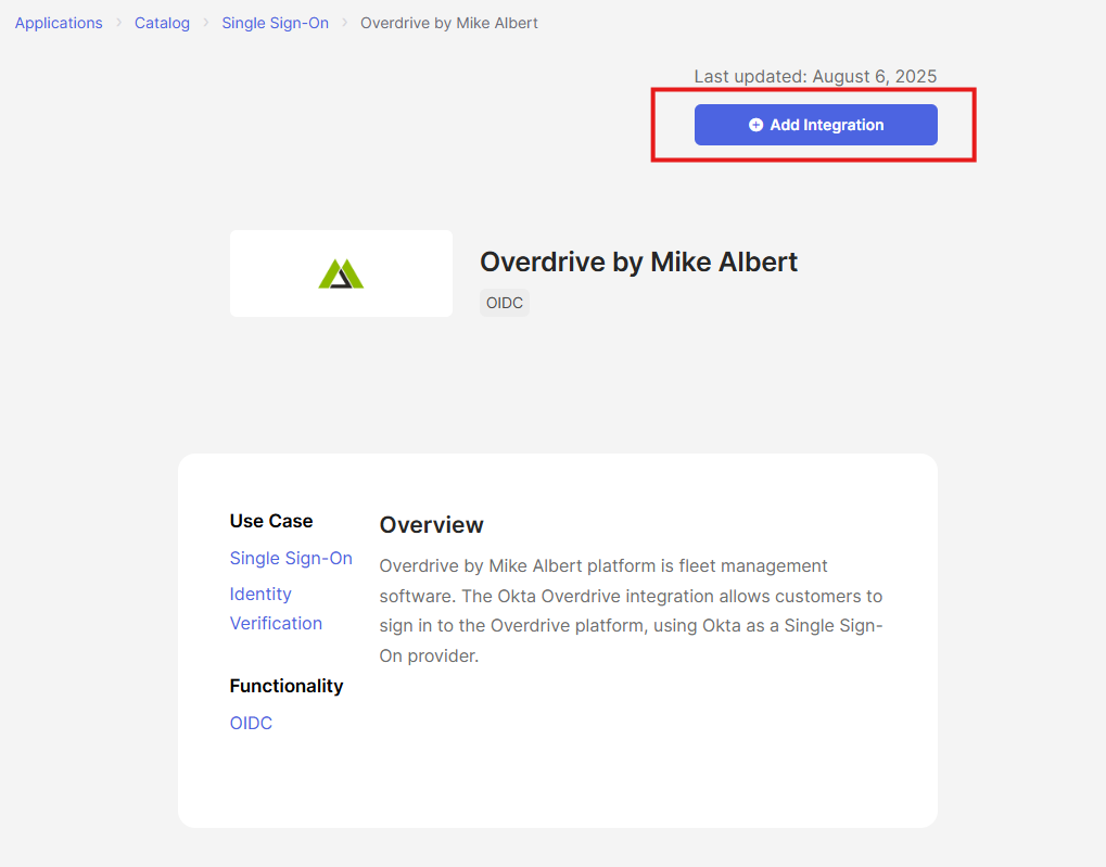In Okta, Go to Applications → Browse App Catalog, and search and add Overdrive by Mike Albert